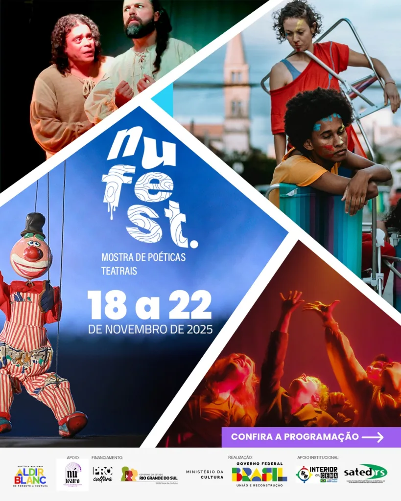 Santiago, RS – A NUFest: Mostra de Poéticas Teatrais inicia nesta terça-feira (18) e segue até sábado (22). Esta é a primeira edição do evento que é totalmente gratuito. O festival ocupará diversos locais de Santiago, como escolas, espaços culturais e praças. O evento apresenta 20 espetáculos e oficinas, desde montagens infantis até peças adultas, com a participação de grupos de várias regiões do estado.