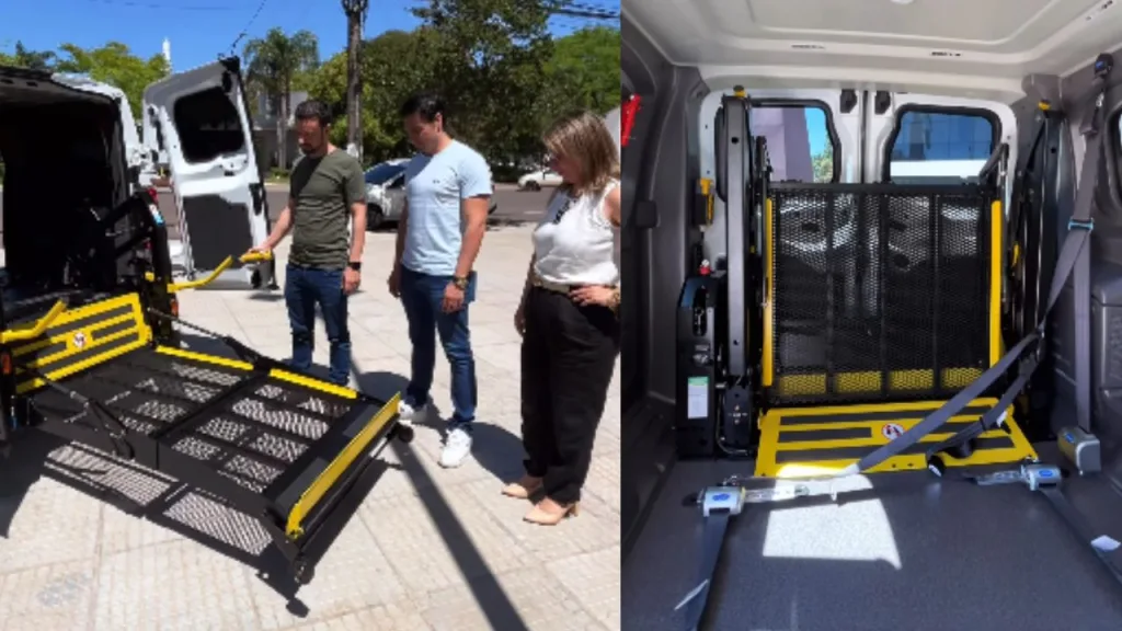 O veículo conta com uma plataforma elevatória que suporta até 300 kg, oferecendo segurança e autonomia aos usuários.